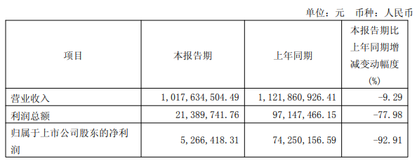 广大特材4月22日披露2026年第一季度报告。公司实现营业总收入10.18亿元,同比下降9.29%;实现净利润526.64万元,同比下降92.91%。