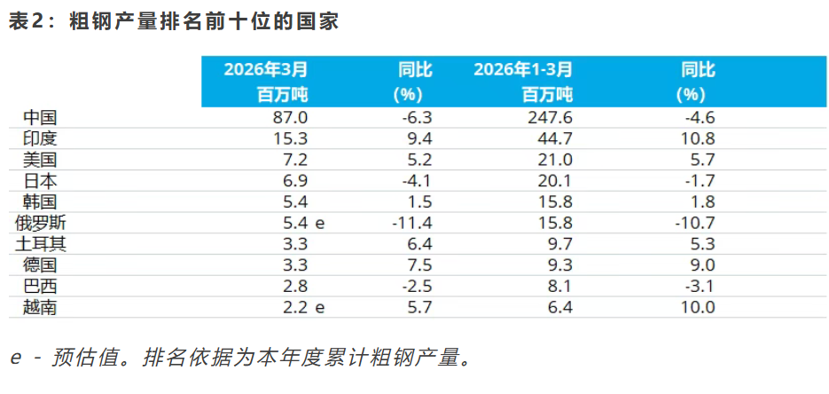 粗钢产量排名前十位的国家 2026年3月,中国粗钢产量为8704万吨,同比下降6.3%; 印度粗钢产量为1530万吨,同比提高9.4%; 美国粗钢产量为720万吨,同比提高5.2%; 日本粗钢产量为690万吨,同比下降4.1%; 韩国粗钢产量540万吨,同比提高1.5%; 俄罗斯粗钢预估产量为540万吨,同比下降11.4%; 土耳其粗钢产量为330万吨,同比提高6.4%; 德国粗钢产量为330万吨,同比提高7.5%; 巴西粗钢产量为280万吨,同比下降2.5%; 越南粗钢预估产量为220万吨,同比提高5.7%。