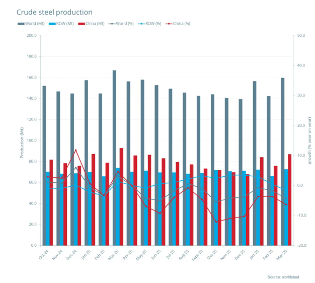 2026年3月全球粗钢产量 2026年3月全球69个纳入世界钢铁协会统计国家/地区的粗钢产量为1.599亿吨,同比下降4.2%。
