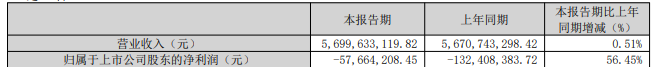 中南股份发布2026年一季度报告,报告期内,实现营业收入57.0亿元,同比增长0.51%;归属于上市公司股东的净利润-0.58亿元。