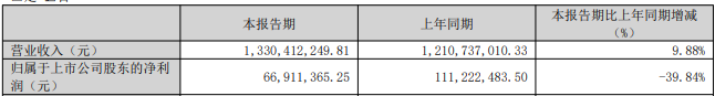 常宝股份公告称,公司2026年第一季度实现营业收入13.30亿元,同比增长9.88%;归属于上市公司股东的净利润0.67亿元,同比下降39.84%。
