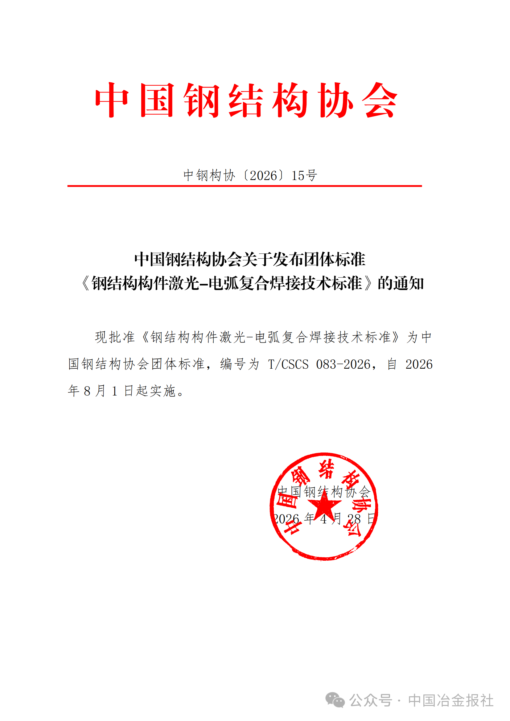 4月28日,中国钢结构协会正式发布了该协会团标《钢结构构件激光-电弧复合焊接技术标准》,编号为T/CSCS083-2026,自2026年8月1日起实施。 据介绍,该标准可以有效解决我国钢结构产业规模庞大,但传统焊接工艺普遍存在生产成本高、作业效率低、焊缝质量稳定性不足等痛点问题。此前,国内外在钢结构焊接领域尚未建立针对此项先进工艺的专门标准,导致其设计、施工与验收缺乏统一依据。 武汉予成激光智造有限公司董事长邹郁京对记者表示,公司深耕钢结构焊接赛道,系统完善了激光-电弧复合焊接成套工艺与装备体系,并牵头启动本标准编制工作,旨在为行业安全、规范、高效应用先进焊接技术提供权威依据和有力支撑。